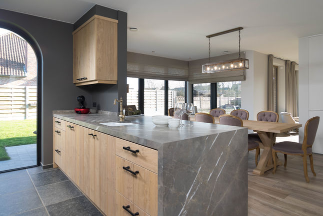 Voor deze woning realiseerde Van Vooren W&T een warme keuken in eiken maatwerk, gecombineerd met een robuust werkblad dat elegant doorloopt in het zijpaneel van het eiland.