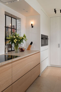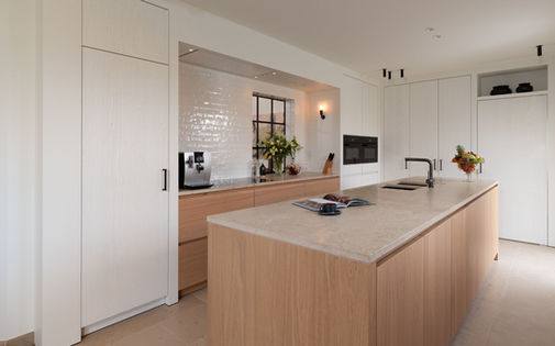 In deze woning werd gekozen voor een helder en tijdloos keukenconcept. Van Vooren W&T stond in voor de realisatie van het maatwerk, met bijzondere aandacht voor geïntegreerde kasten en een rustige totaalindeling.