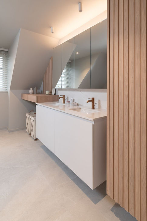 In de badkamer werd dezelfde materiaal- en vormentaal doorgetrokken. Het maatwerk badkamermeubel sluit naadloos aan bij de architectuur van de ruimte en biedt voldoende opbergruimte zonder visuele drukte. Subtiele details en zorgvuldig gekozen afwerkingen zorgen ook hier voor rust en dagelijks comfort.