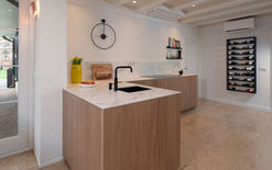 Dankzij de open verbinding met de leefruimte, het balkenplafond en de afgeronde doorgangen sluit het maatwerk naadloos aan bij de bestaande architectuur van de woning. Het resultaat is een keuken die modern aanvoelt, maar tegelijk warmte en karakter behoudt.
